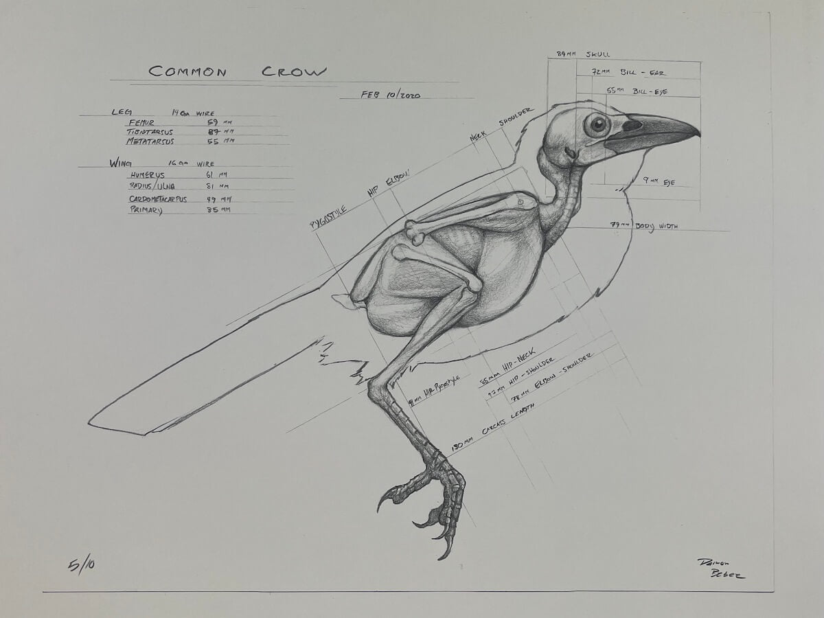 This 16x20 print is a highly detailed and accurate representation of a crow. The schematic has been carefully crafted by hand-tracing the exterior of the bird. After skinning, the bird's carcass is traced and exact measurements are taken and added, to ensure the most accurate life-like representation of the crow.