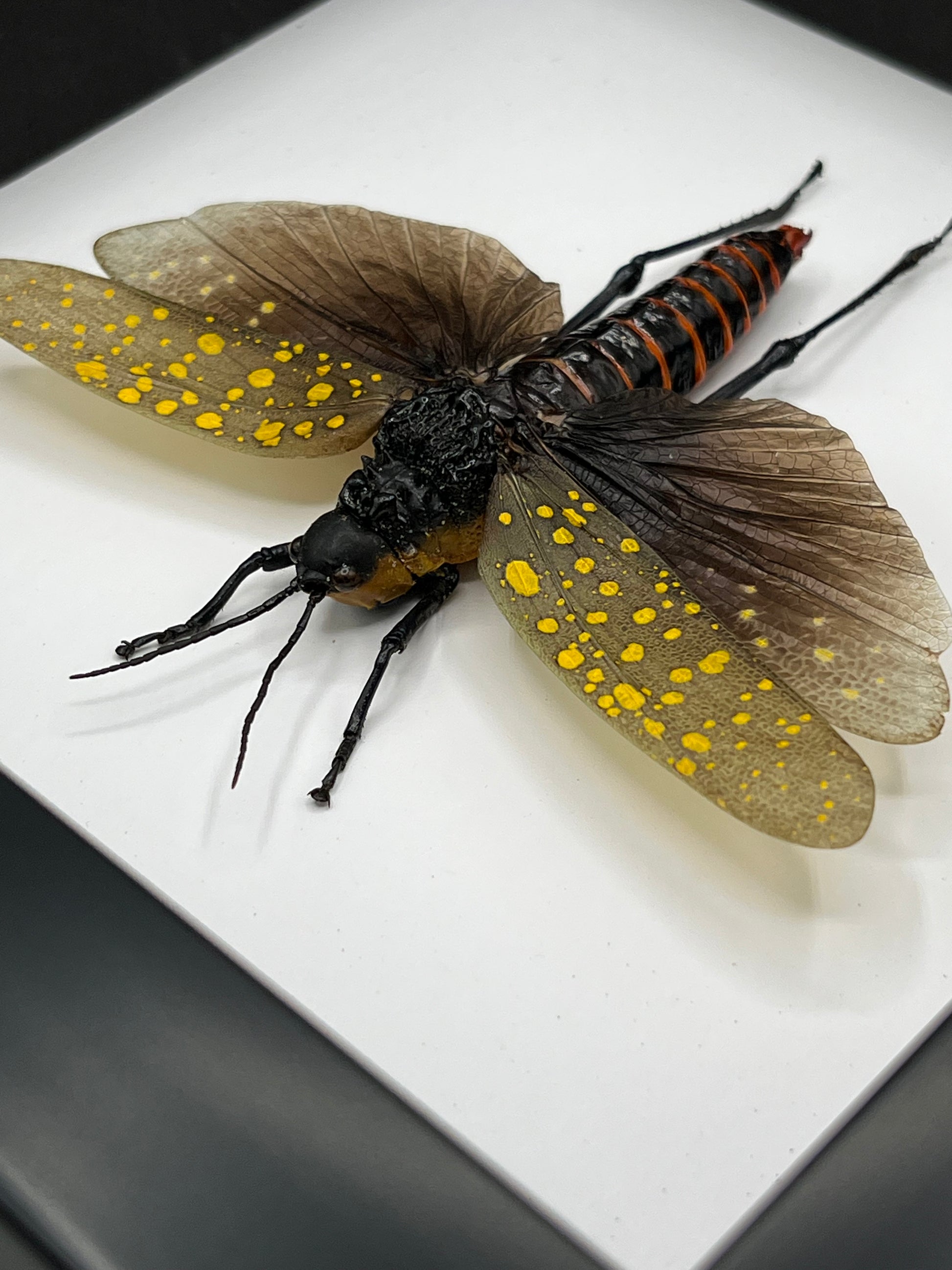 Northern Spotted grasshopper in 6”x6” shadowbox. A species of grasshopper from Indonesia.