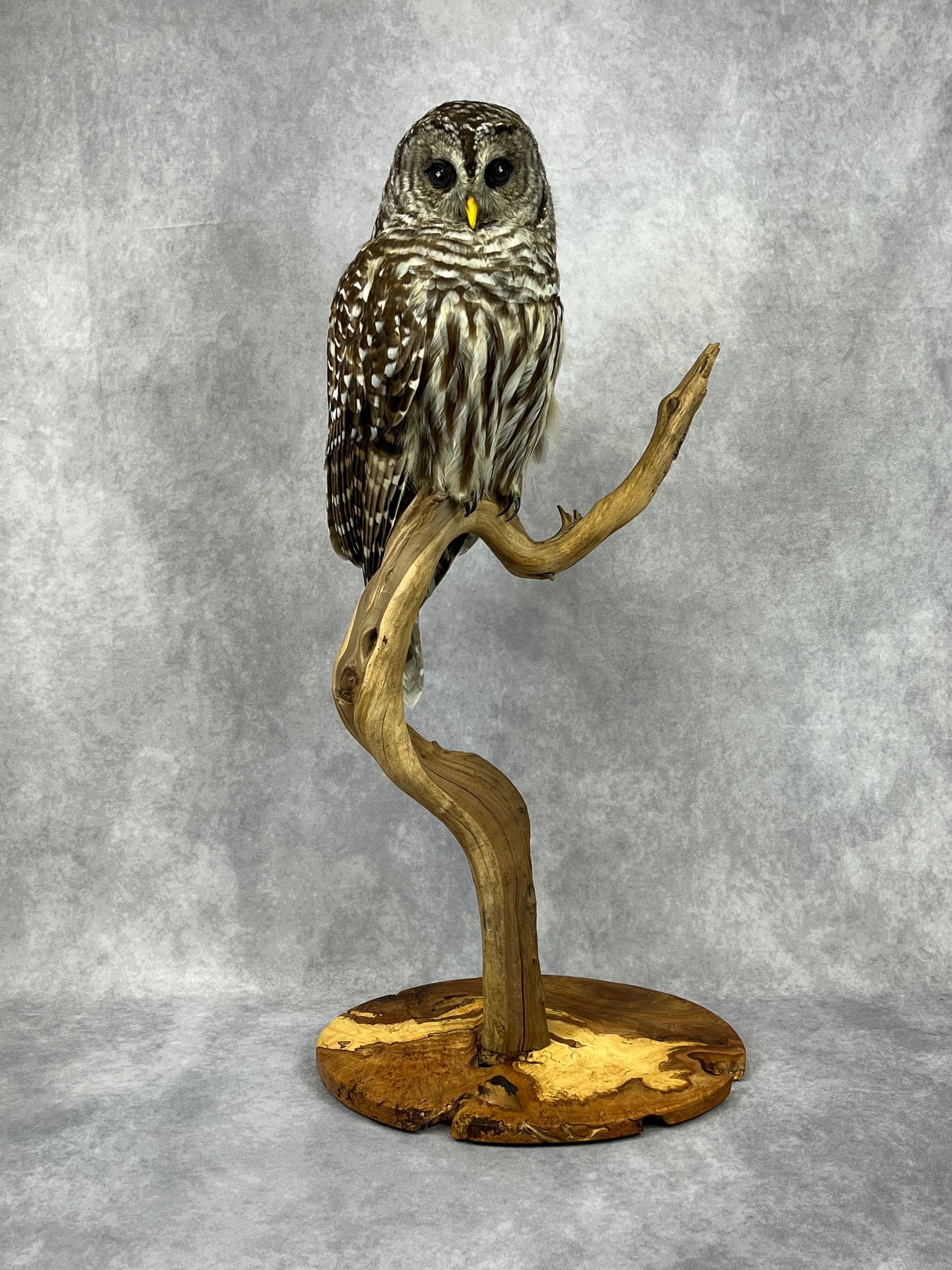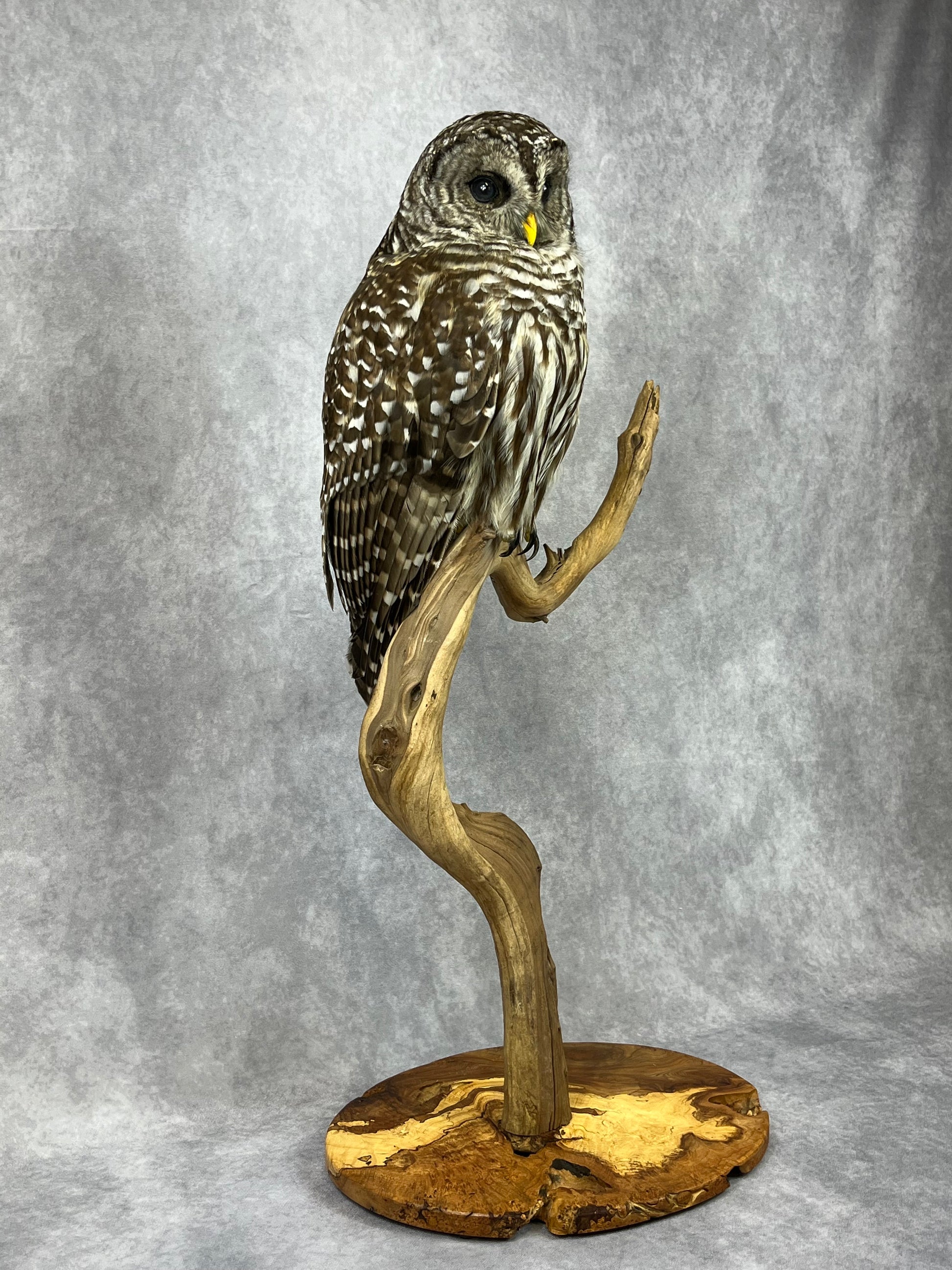 Female Barred Owl mounted on hand crafted, spalted maple base.