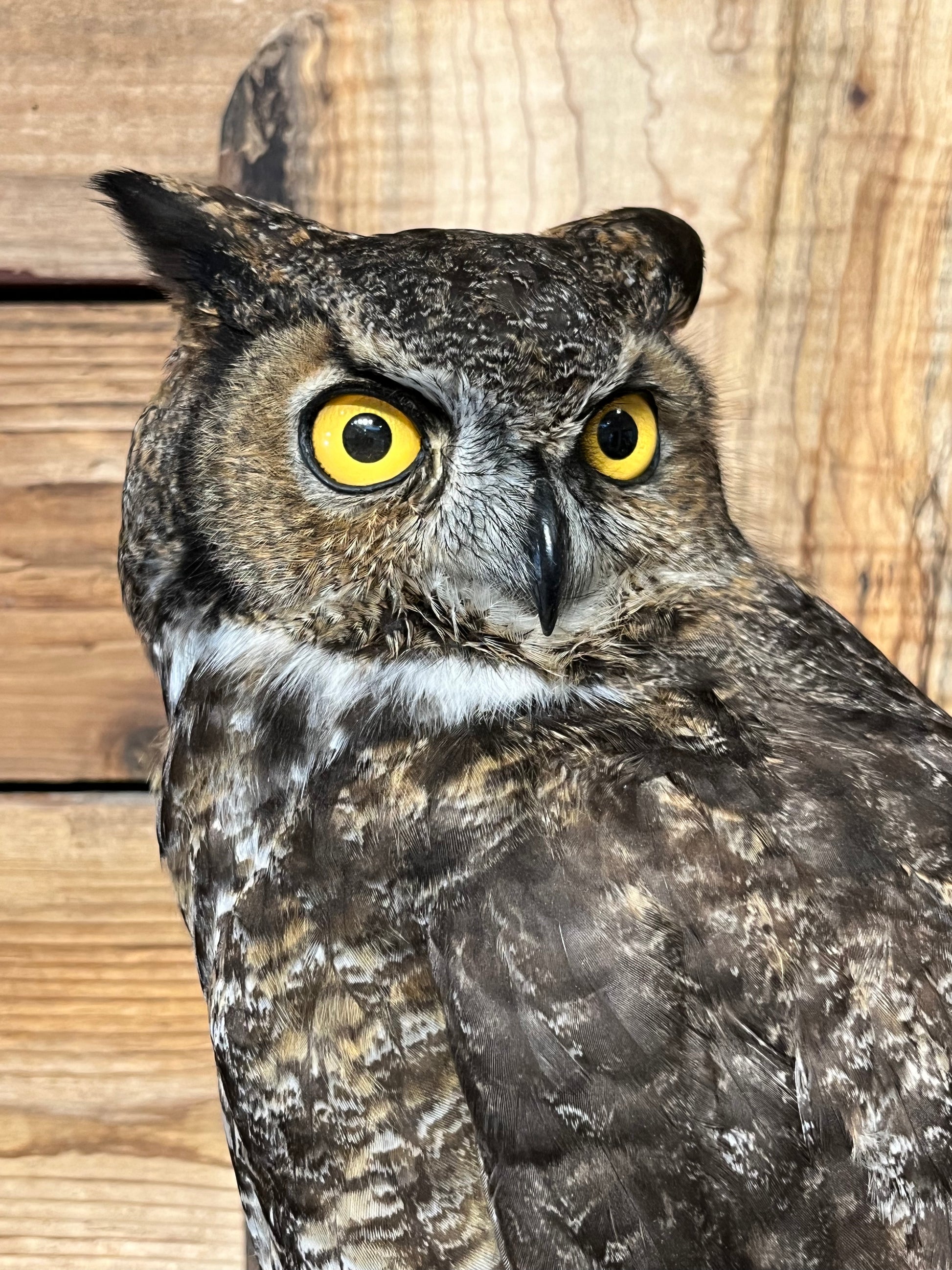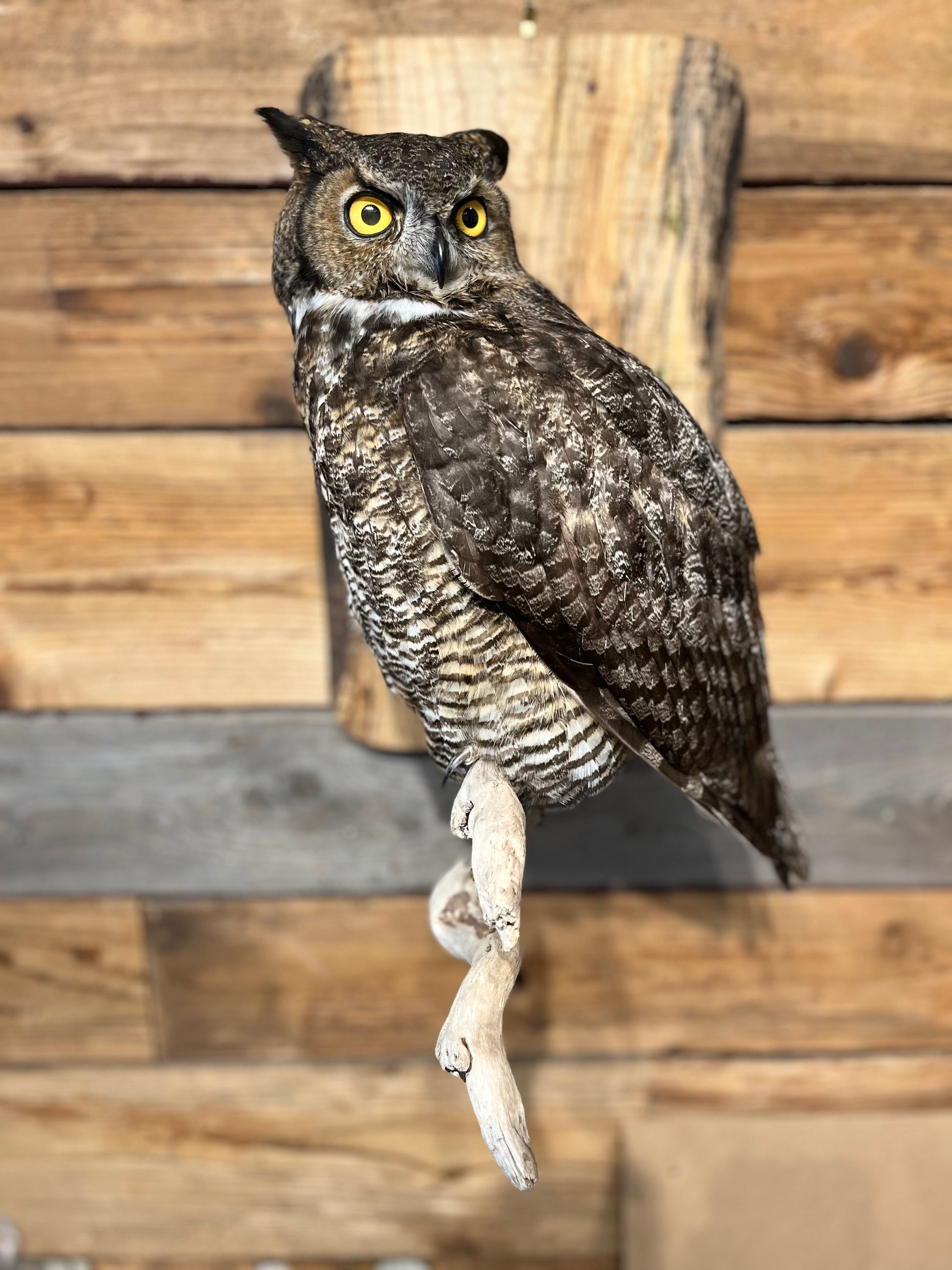 Wall mounted Dark (costal) morph, Great Horned Owl on live edge, spalted maple back plate.
